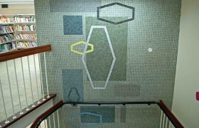 The four-storey building has a reinforced concrete-frame and a non-load-bearing façade on Theobalds Road in narrow russet brick with a generous expanse of metal-framed glazing, which looks particularly striking when lit up at night. In their listing report of 2010 (to which I am much indebted) English Heritage note that ‘Holborn was the first library to exploit the potential of a large area of glazing to create a modern image for the public library, something which became standard in library design afterwards’. Above the glazing are a row of square windows, a set back, steel-framed upper storey and a flat roof. Below it are attractive stone and mosaic panels in a hexagonal pattern picked by the blue floor tiles in the entrance, and the mosaic in the stairwell wall.