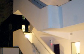 There are many joyful things about the Isokon. One of them is the Belsize Wood Nature Reserve at the back. Now trimmed back from its wildest state, the squirrels are most amusing. The second is the lighting of the building at night. Coming home in the evening she looks quite lovely, entirely flattering.