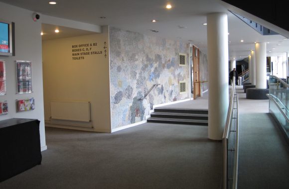 The theatre design draws on a range of precedents. The block of shops and actors’ flats (an innovation) facing Corporation Street reprises Ralph Tubbs’ Indian students’ hostel in London. The Belgrade Square elevation, meanwhile, evokes the materials and forms of the Festival Hall, which was the only major arts building to have been built in Britain since 1939 and was similarly a ‘civic’ project. Internally, the theatre’s foyers are shared by all patrons rather than being segregated by ticket price, as was typically the case in older theatres. In addition, they were to be open all day for refreshments. Art formed an integral element of their design. Martin Froy’s mosaic, ‘Four Seasons’, covers the long wall of the foyers on both levels. It was intended as an indeterminate backdrop to the gathering audience, whose presence and movement was understood to complete the design in an example of the kind of ‘modern monumentality’ promoted by the theorist Sigfried Giedion. Chandeliers by Bernard Schottlander reinterpreted theatre tradition in modern form.