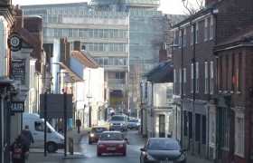 The lower levels are usually overlooked, however, because Sovereign House is an unquestionably large building; it is one of the first large buildings one encounters when approaching Norwich from the northern suburbs. From the north, the longer wing completely occupies the end of St. Augustine Street’s vista, blocking what would otherwise be a perfectly framed view of the spire of Norwich Cathedral. Perhaps it is this insensitivity of broader context that inspired the relatively recent re-arrangement of St. Augustine Street into a country-bound one way street.