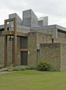 Its architecture was vitally, if coincidentally, affected by the great chapel row. Had the chapel been built in 1960, it would have had a conventional rectangular plan. But the delay, and the opportunity of a freestanding building, allowed a total rethink. What intervened was the arrival of the ‘liturgical revolution’. The new mode was for centrally-oriented churches, circular, fan-shaped, or, as here, square. The congregation is brought into intimate relationship with the altar. Between Basil Spence’s Coventry Cathedral (1956-62), with its traditional nave, and Frederick Gibberd’s circular Liverpool Cathedral (‘Paddy’s wigwam’) (1962-7), there lay a transformation. Especially influential were Maguire and Murray’s St Paul’s Church, Bow Common (1958-60) and Peter Hammond’s Liturgy and Architecture (1960).
