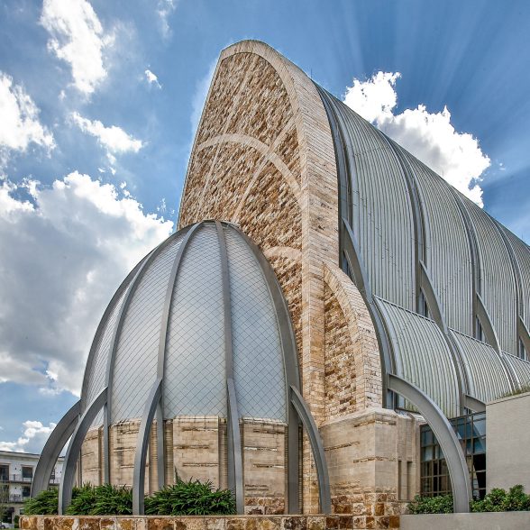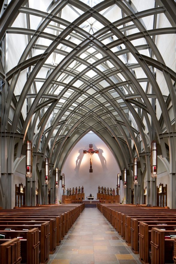 Above all, though, modernist influences are present throughout. The Church’s most distinctive feature is its exposed internal and external steel structure. Over 1,270 tons of fabricated structural steel were used in the project. The roof was constructed using 34,000 ft.2 of customised standing seam panels which vary in length and are joined with transverse seams that mirror the crossing structural steel members inside the building. Eight exposed structural steel buttresses penetrate the roof and are highlighted by custom-painted aluminium plate panels. The rear elliptical dome-shaped roof of the church is clad with diamond-shaped shingles.