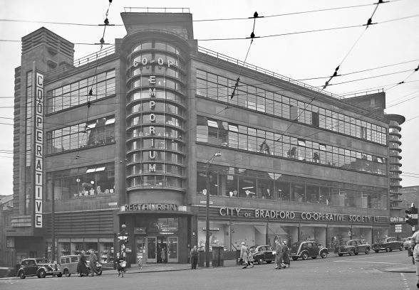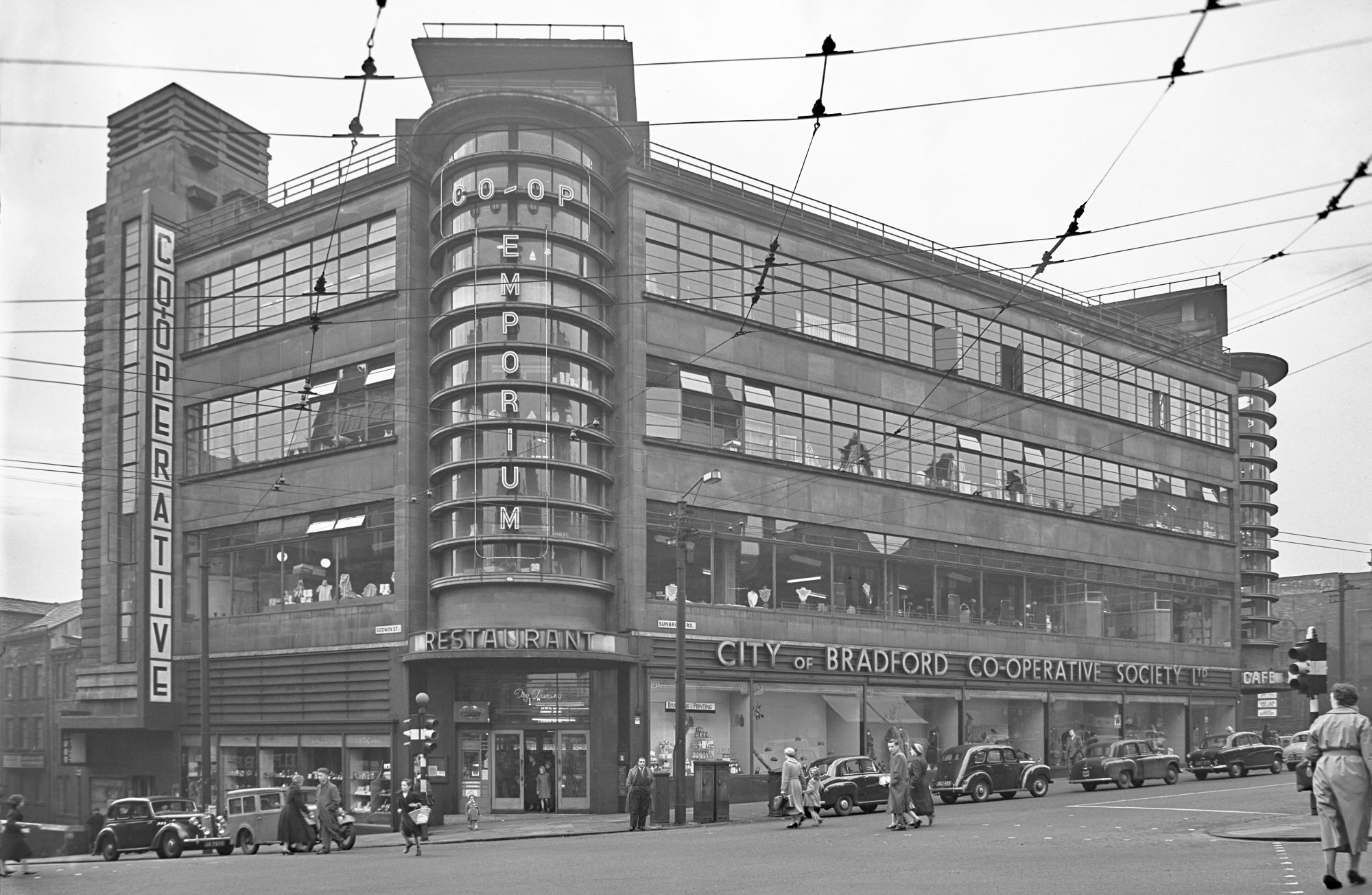 In a city known for its handsome Victorian architecture, the opening of Bradford Co-operative Society’s new emporium in 1936 must have been the ultimate shock of the new. W.A. Johnson’s Sunwin House (a portmanteau of the street names Sunbridge Road and Godwin Street, at whose intersection it stands) was heavily influenced by German architect Erich Mendelsohn, particularly his designs for the Schocken Department Store in Stuttgart (1924-26), and brought sophisticated International Modernism to West Yorkshire.