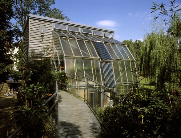 In some photographs, and from some angles, Hope House appears to emerge from within a swampland: trees surround the abode, solar electric panels and thermal collectors adorn the outer surfaces, and a raised, recycled-steel gangway that connects the living space to the street adds to a sense of treetop wildness.