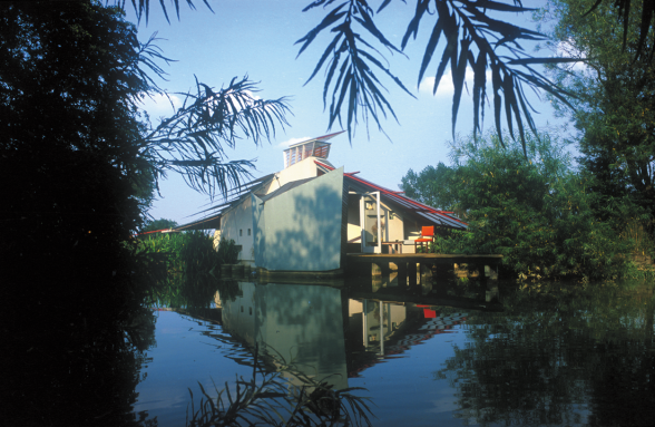 After the war, the land was used as a nuclear missile site before its abandonment in the mid-1960s. By 1994, the plot was owned by a photographer, Gina Glover, who had begun to think about capturing the surface of a pond on film. Together, McLaughlin and Glover started opening up the site of an old bomb pond, “previously stagnant and lost in a tangle of briar”, oxygenating the water with fish, water plants, and filtration. Dragonflies quickly returned to the waters. The early designs for the building compared Glover’s lens, hovering above the pool, to the reconnaissance flights from the nearby base, and a “dark, wing-like form” began to emerge at the edge of the water.