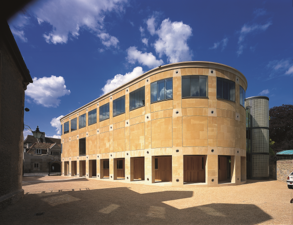 That said, there is an elusive virtuosity to this creation that invites closer inspection: from above, a view of the building and its wider plan reveals a monolithic pill, somewhat cellular in form, inserted into a quadrangular, largely baroque host. This implant sits with a stillness that boarders stealthy, its beautiful glass-brick stairwell protruding periscopically outwards like the eye of a snail. From the ground there is a seamlessness in the way the performance space occupies its august context. Enclosed by a colonnade and clad in Ketton limestone, there are formal and material references to Christopher Wren’s nearby College Chapel that reassure the viewer of a sensitivity to the building’s intellectual and architectural milieu.