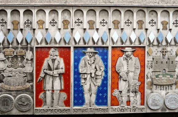 The BHS Stockport mural is situated on the outside of the building and comprises five concrete panels with brightly coloured mosaic, depicting the history of the town across six centuries. It includes images of earls, knights, politicians, clergymen, the founder of the local grammar school and a farmer, all of whom played a significant role in the development of the town.