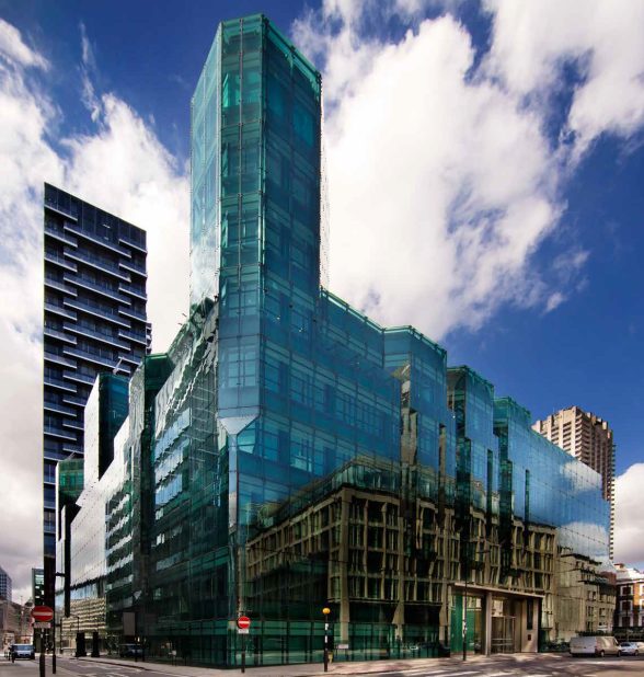 Lasdun drew on his own wealth of experience as an architect and on the work of others, namely the great Charles Rennie Mackintosh (1868-1928) and his Glasgow School of Art, to create this remarkable ‘glass castle’, which, with its fortified forms and reflective green-tinted glass elevations, manages to be both dynamic and sculptural and responsive to the immediate streetscape. As Lasdun wrote “Towers, turrets, a central drum, steeply pitched roofs and an outer veil suggest, as in some buildings by Mackintosh, a certain castellar metaphor, a hint of the glass castle”. Indeed, the label of one of Lasdun’s models of the building read ‘Homage to Mackintosh’.
