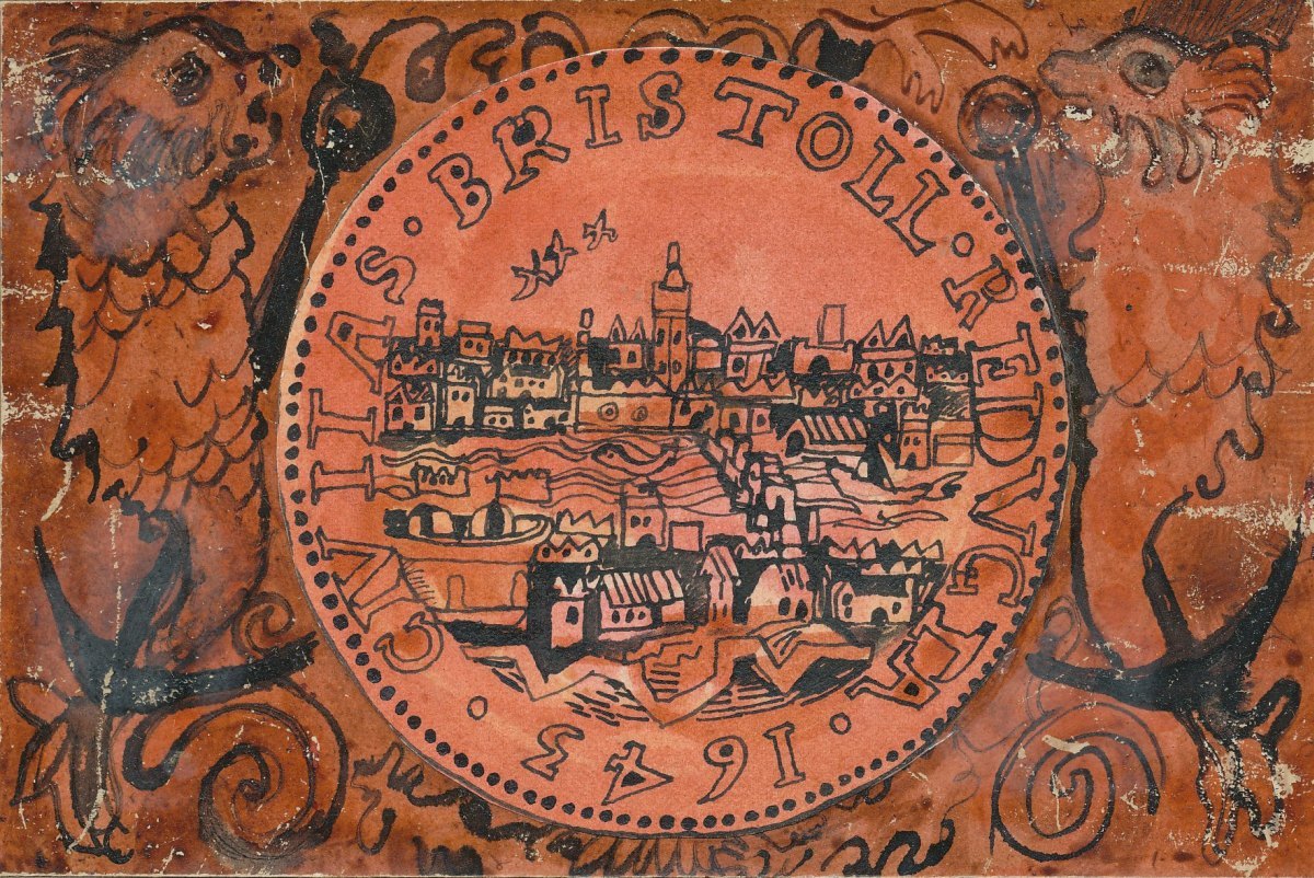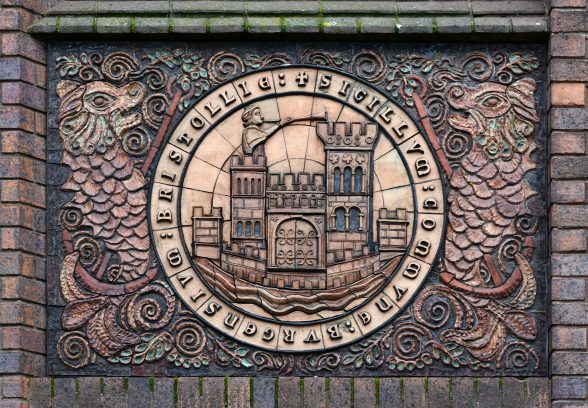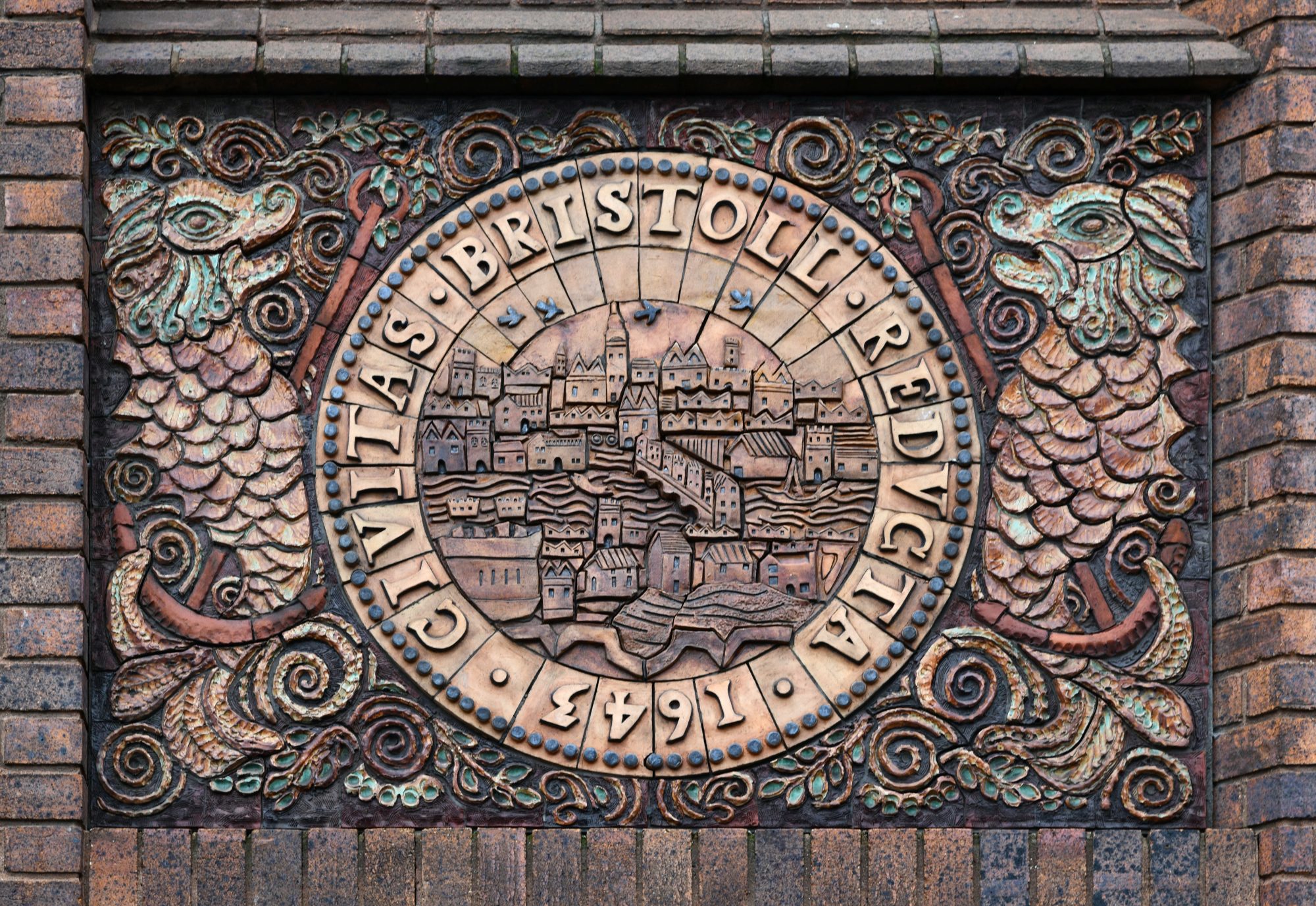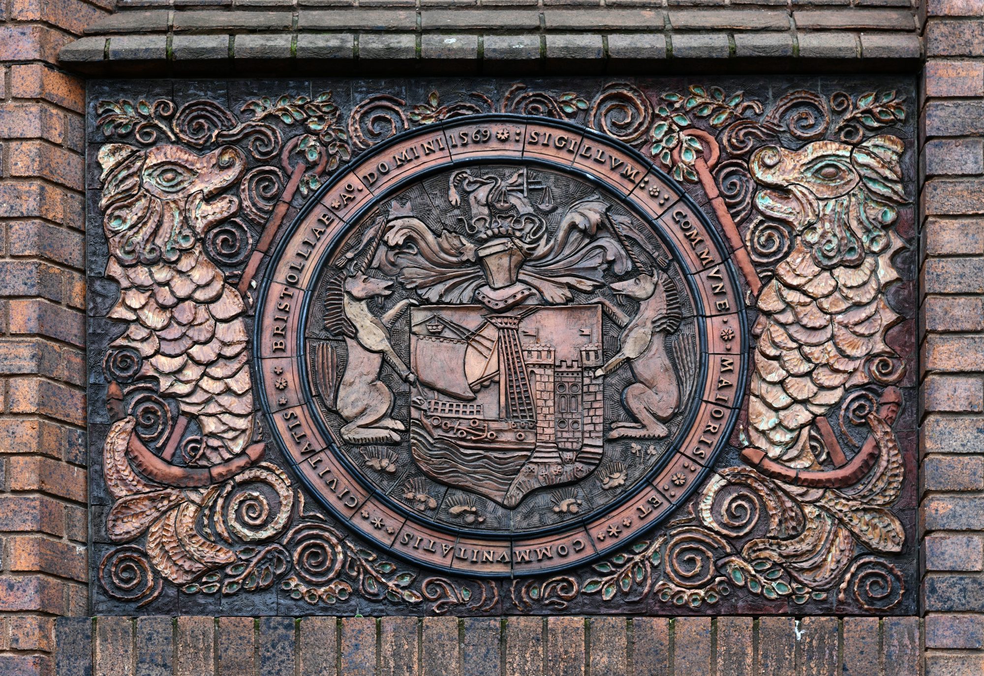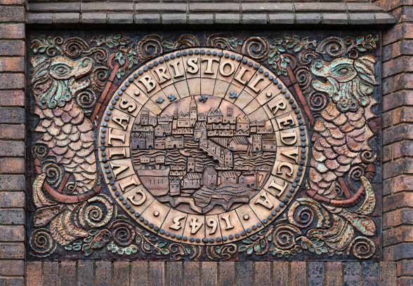 Threlfall recalled: “A theme was chosen of Bristol’s history and we spent several weeks researching suitable images/ Instead of looking for notable buildings we searched for smaller artefacts: local museums and churches for seals, trade tokens, coinage and archival images. All were to fit inside a roundel. We thought that a link containing these different images should be a repeating motif and chose (with hindsight unfortunately!) the two dolphins facing each other from Edward Colston’s 18th century crest. These are of course also very much a part of Bristol’s history.”