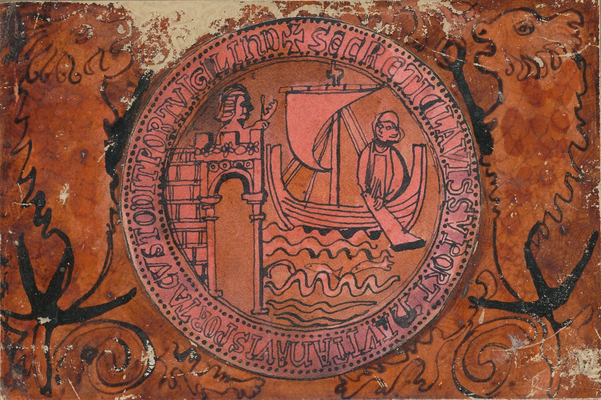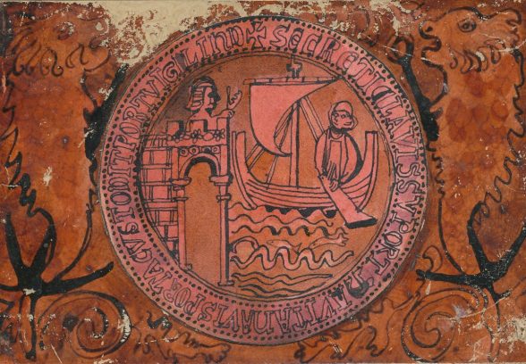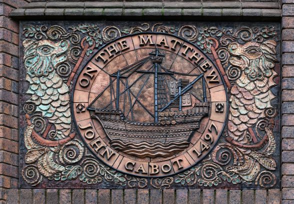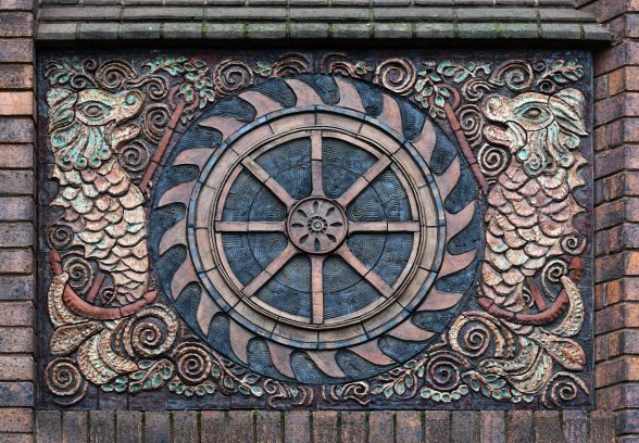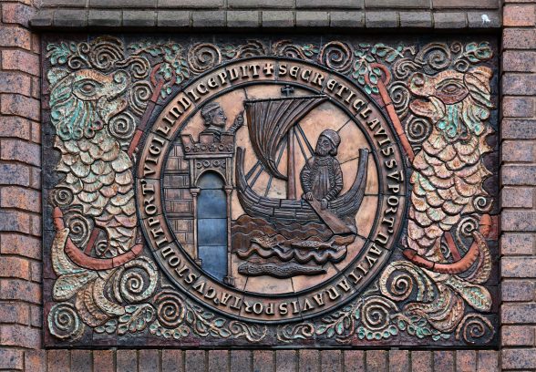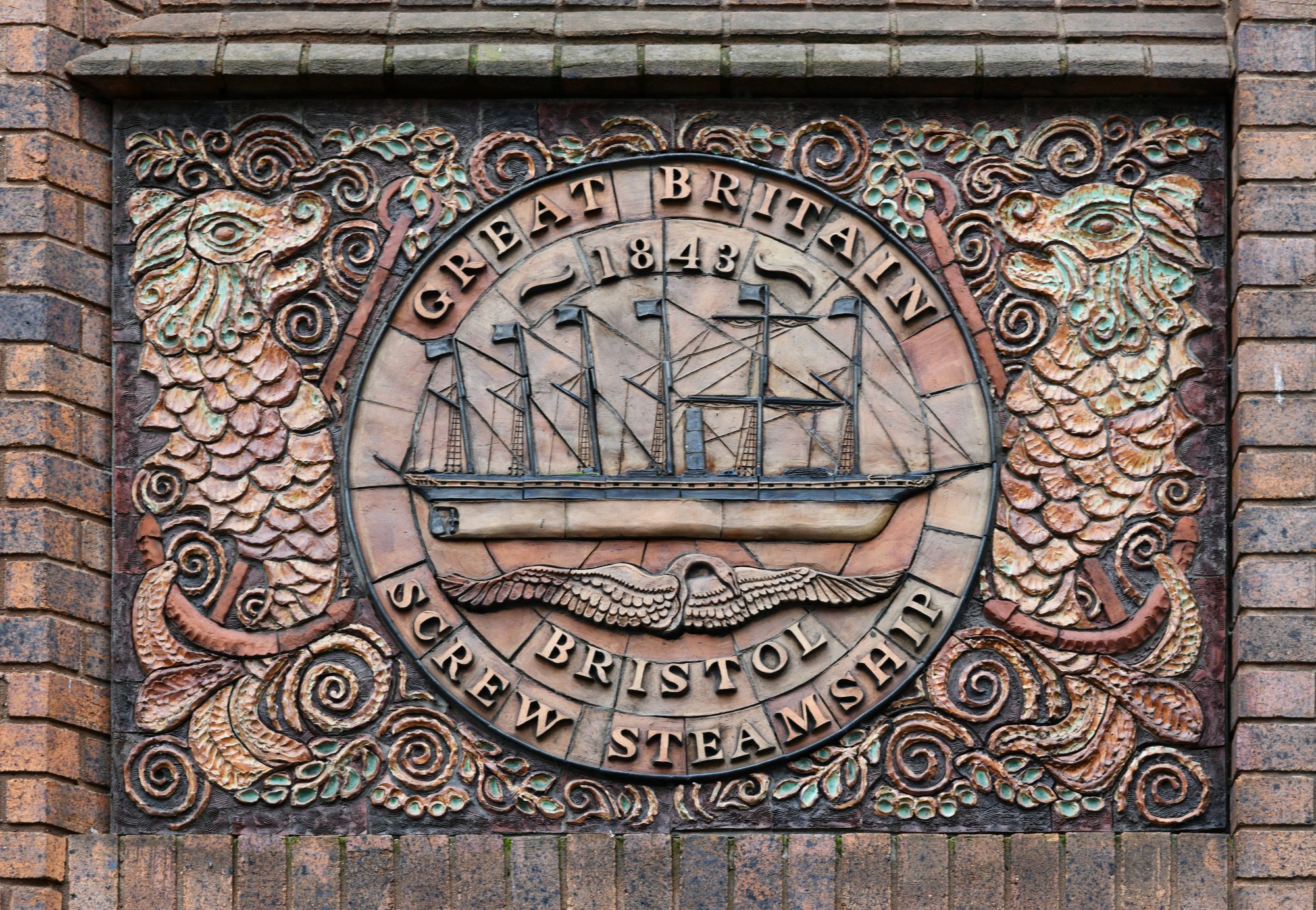 Threlfall recalled: “A theme was chosen of Bristol’s history and we spent several weeks researching suitable images/ Instead of looking for notable buildings we searched for smaller artefacts: local museums and churches for seals, trade tokens, coinage and archival images. All were to fit inside a roundel. We thought that a link containing these different images should be a repeating motif and chose (with hindsight unfortunately!) the two dolphins facing each other from Edward Colston’s 18th century crest. These are of course also very much a part of Bristol’s history.”