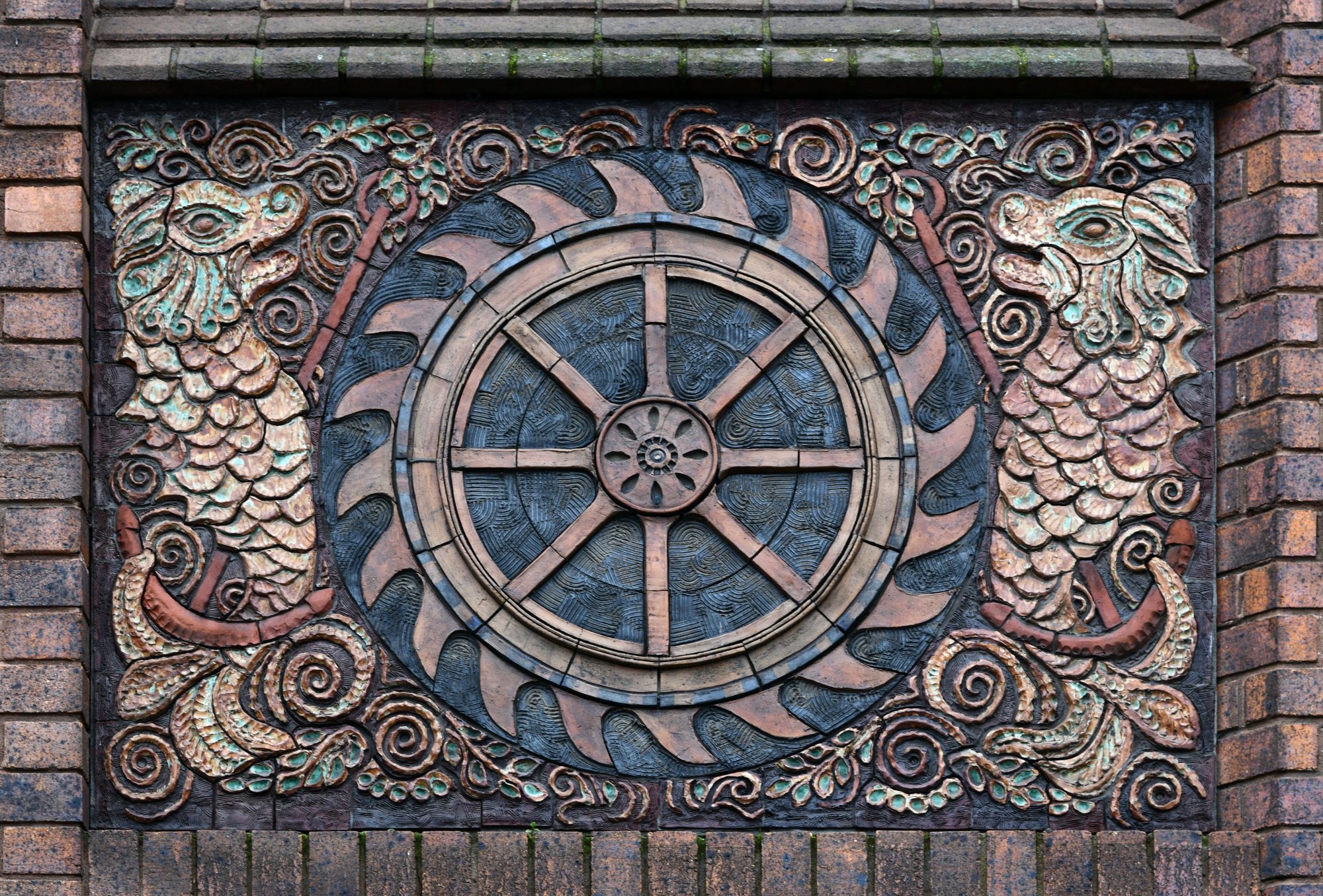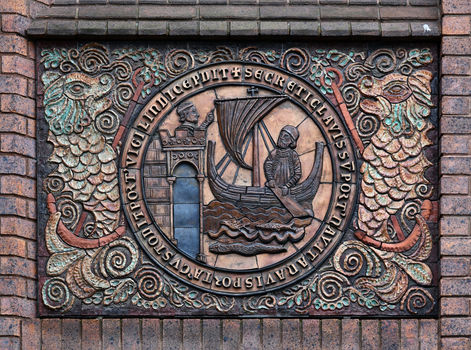 The architects built a series of shallow cavities (1500 mm x 1000 mm) into the north façade at first floor level, to accommodate fifteen decorative panels. Threlfall and Collings worked on several projects for Standard Life from the 1970s – 1990s and were commissioned to propose design ideas for the site. Their research resulted in a rich and varied visual tableau of the city’s story: coins minted during Civil War, an Elizabethan seal, 17th century tokens used in a public house, mercantile symbols, and the 20th century aerospace industry.