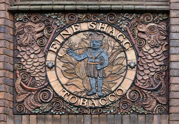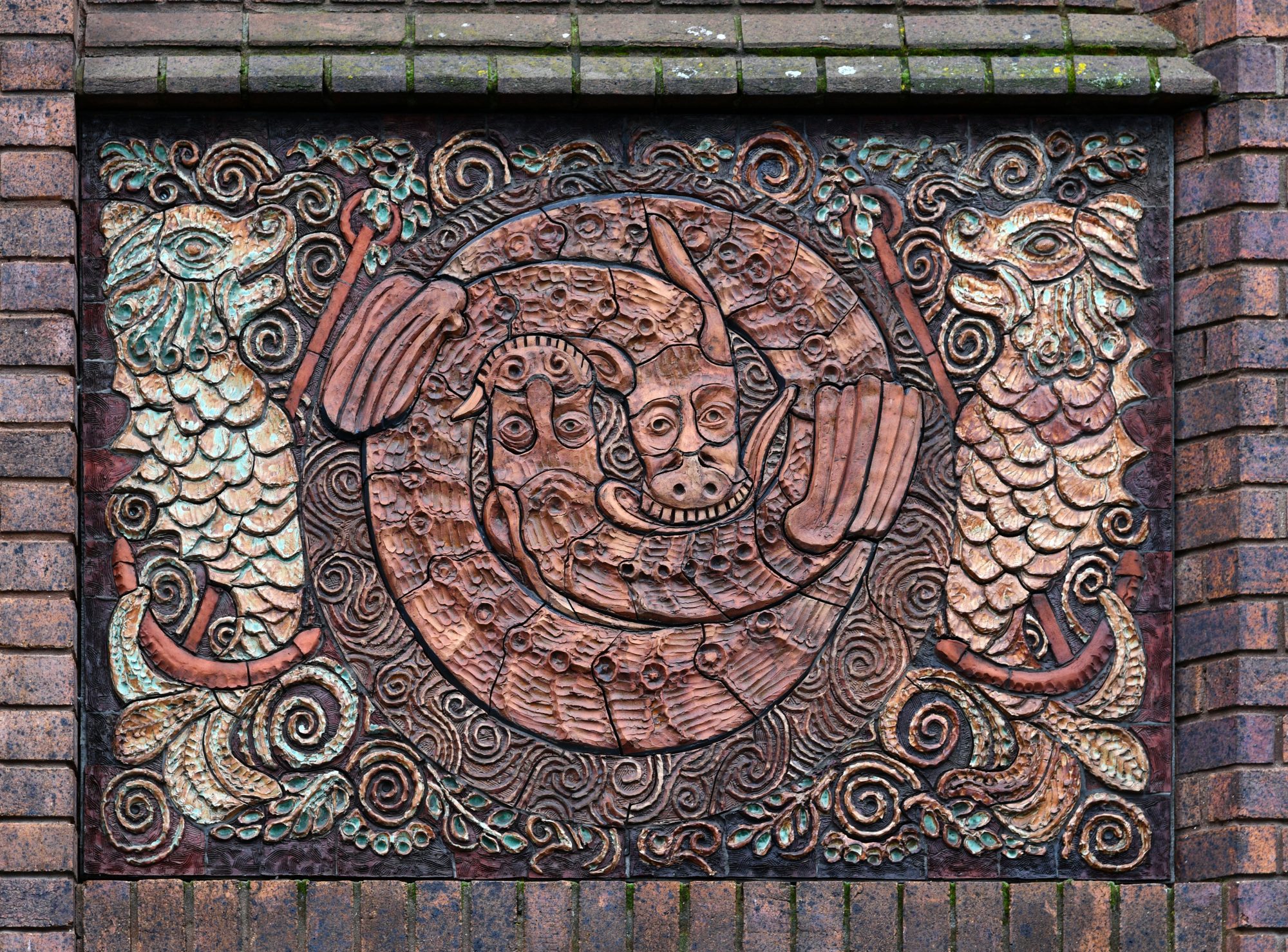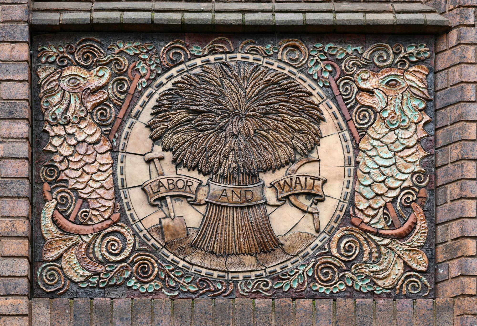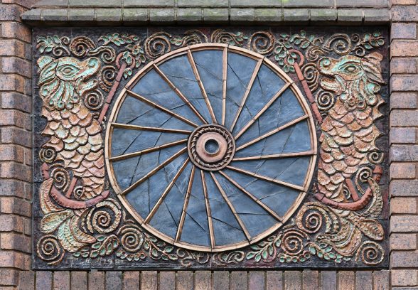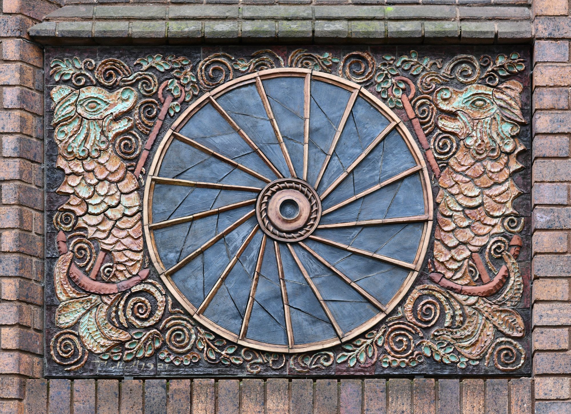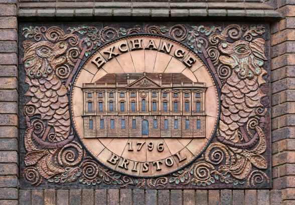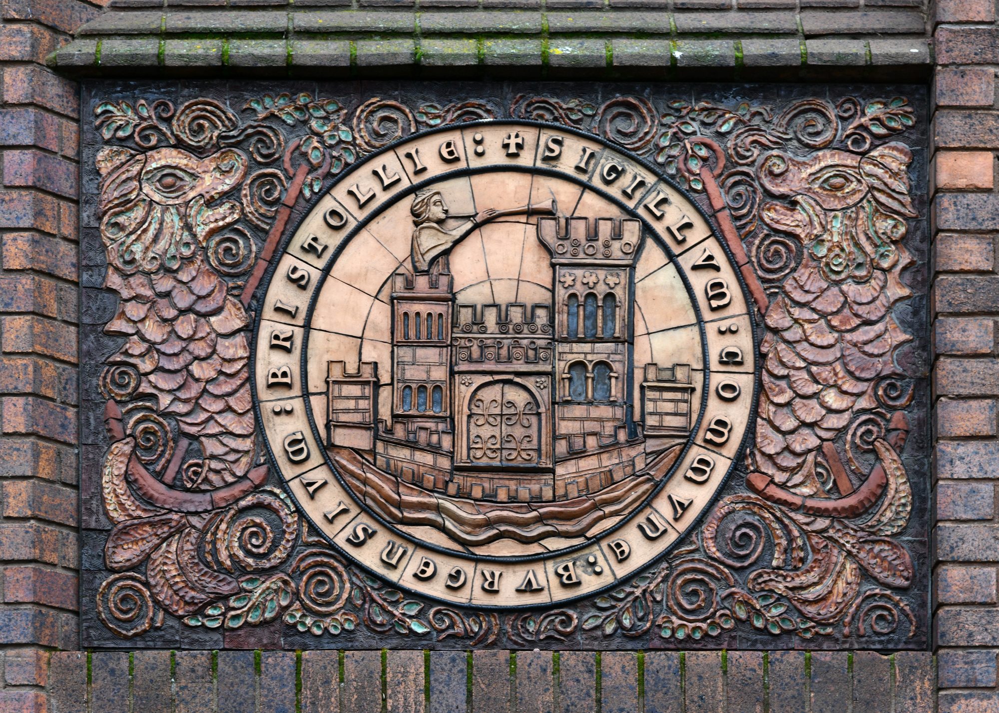 The 15 panels were hand sculpted in contrasting buff and terracotta clays, and selectively used a reduced palette of copper and manganese glazes. The central roundels were framed with a repeating cartouche featuring two dolphins from the family crest of Edward Colston; the Bristol merchant, slave trader, philanthropist and Tory MP who was once widely commemorated in Bristol landmarks. Growing awareness of Colston’s central role in the transatlantic slave-trade saw his statue toppled and pushed into Bristol Harbour in June 2020 during protests in support of Black Lives Matter. The city’s concert venue, Colston Hall, was renamed Bristol Beacon in November 2023, while the Colston dolphin was removed from University of Bristol’s logo in February 2024.