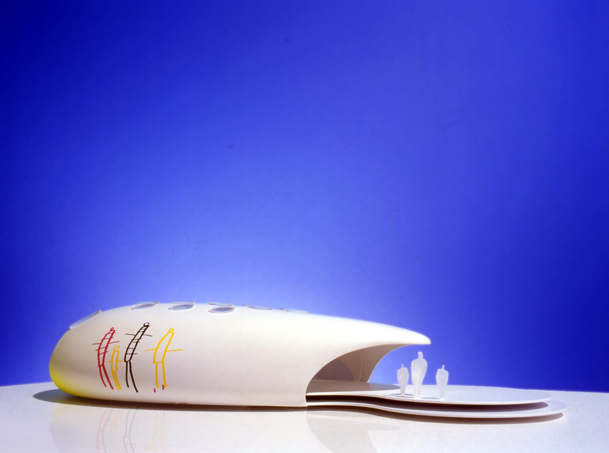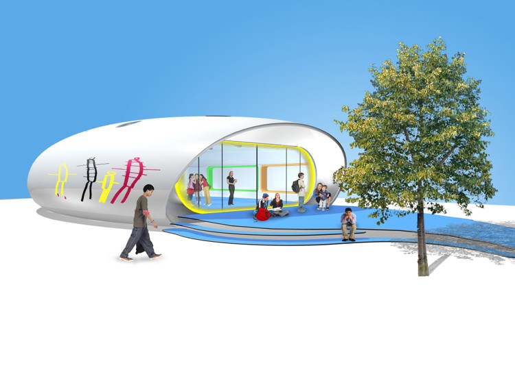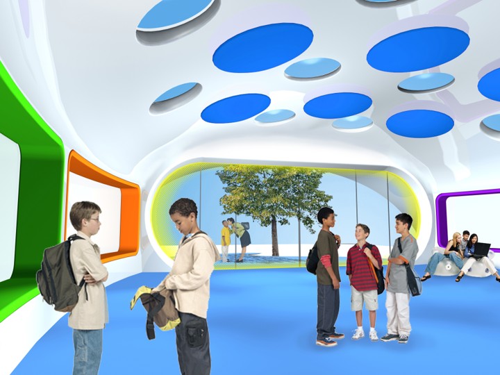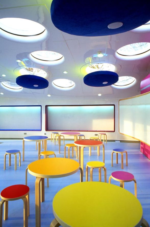 Future Systems 100sqm freestanding ‘Ingenium’ classroom was prefabricated from modular components, using semi-monocoque boat-building technology. Taking cues from the practice’s iconic Media Centre at Lord’s Cricket Ground – winner of the Stirling Prize in 1999 – this miniature version shares the same supernova-white GRP shell, porthole skylights and panoramic glazed frontage, infamously dubbed ‘Cherie Blair’s mouth’ on the larger Media Centre. Decals of drawings by the school children themselves decorate the rear of the exterior shell, while built-in seating and digital white-boards internally left a large open space for up to 30 people. The use of suspended circular acoustic discs, integrated with the high-level natural ventilation openings, ensured that the appropriate acoustic environment was achieved. The unit is also equipped with a self-contained toilet, cloakroom and services area.