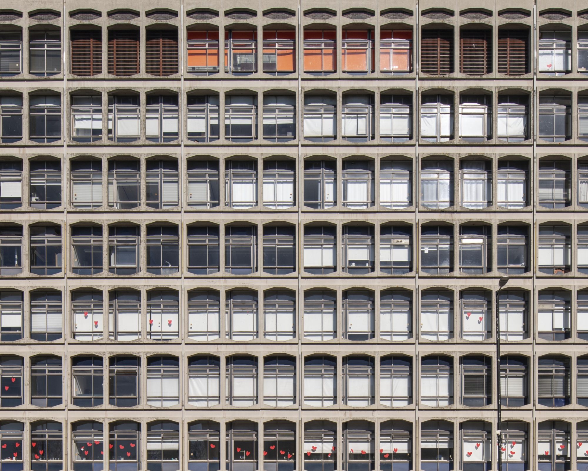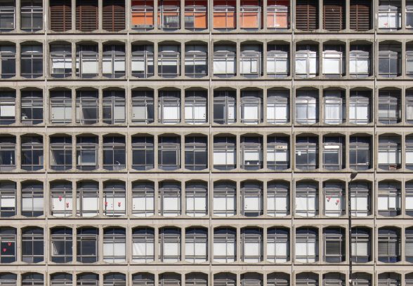 The 8-storey building is defined by a geometric ‘exoskeleton’ of pre-cast modular concrete panels, its tripartite openings with canted corners a nod to swinging sixties pop-art and graphic design. The robust detailing and flexible plan has ensured the building has remained in its original use for more than 50 years and survives in excellent condition. At the base of the tower is ‘Echelons with Concrete Pillars’, a site-specific sculpture commissioned to mark the inauguration of the new building, by notable sculptor Hubert Dalwood (1924-76).