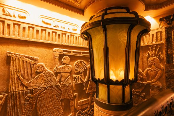 Linking these floors allowed Mitchell to incorporate 25-foot-high columns clad in reproduction hieroglyphs around the escalator, with illuminated papyrus-like column capitals, in keeping with the colossal scale of ancient Egyptian buildings. The scheme is characterised by 300 moulded panels, painting and bas-reliefs, hand-carved by Mitchell and representing scenes of everyday Egyptian life. The ceiling frieze is notable as the culmination of a unifying ‘Stairway to Heaven’ concept, with its interpretation of the ancient astrological wheel as taken from the Temple of Hathor’s wall relief panel held in the British Museum