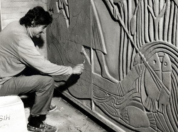 Mitchell carving the Harrods reliefs, c1997